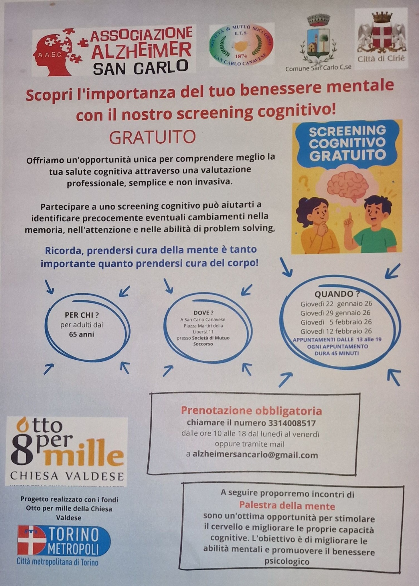 L'Associazione Alzheimer San Carlo organizza n. 4 appuntamenti per effettuare uno screening cognitivo per aiutare a identificare precocemente eventuali cambiamenti nella memoria, nell'attenzione e nelle abilità di problem solving. Gli incontri si svolgeranno presso la SOCIETA' DI MUTUO SOCCORSO di San Carlo C.se, in Piazza Martiri della Libertà 11, dalle ore 13:00 alle ore 19:00 (ogni appuntamento dura 45 min) nei seguenti giorni: